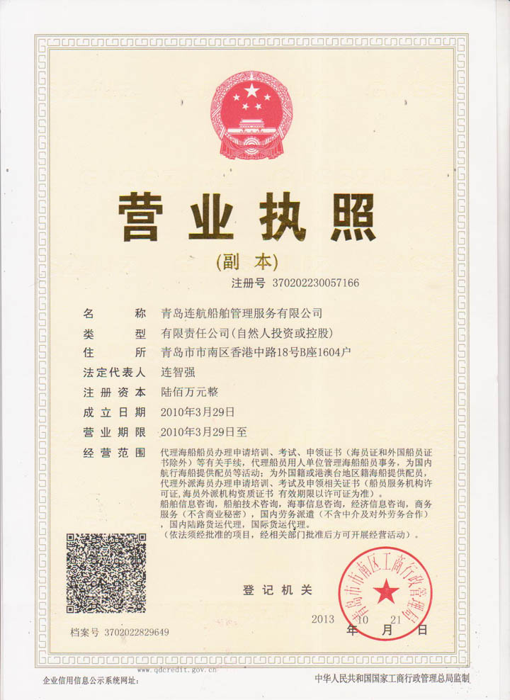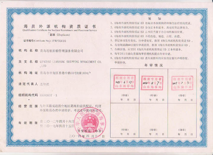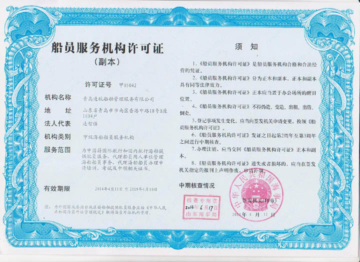 2012年04月青島連航船舶管理服務(wù)有限公司取得《海員外派機(jī)構(gòu)資質(zhì)證書(shū)》,為海洋船舶提供配員,代理船員用人單位管理海洋船舶船員事物,代理海洋船舶船員申請(qǐng)培訓(xùn)、考試、申請(qǐng)證書(shū)等業(yè)務(wù)。